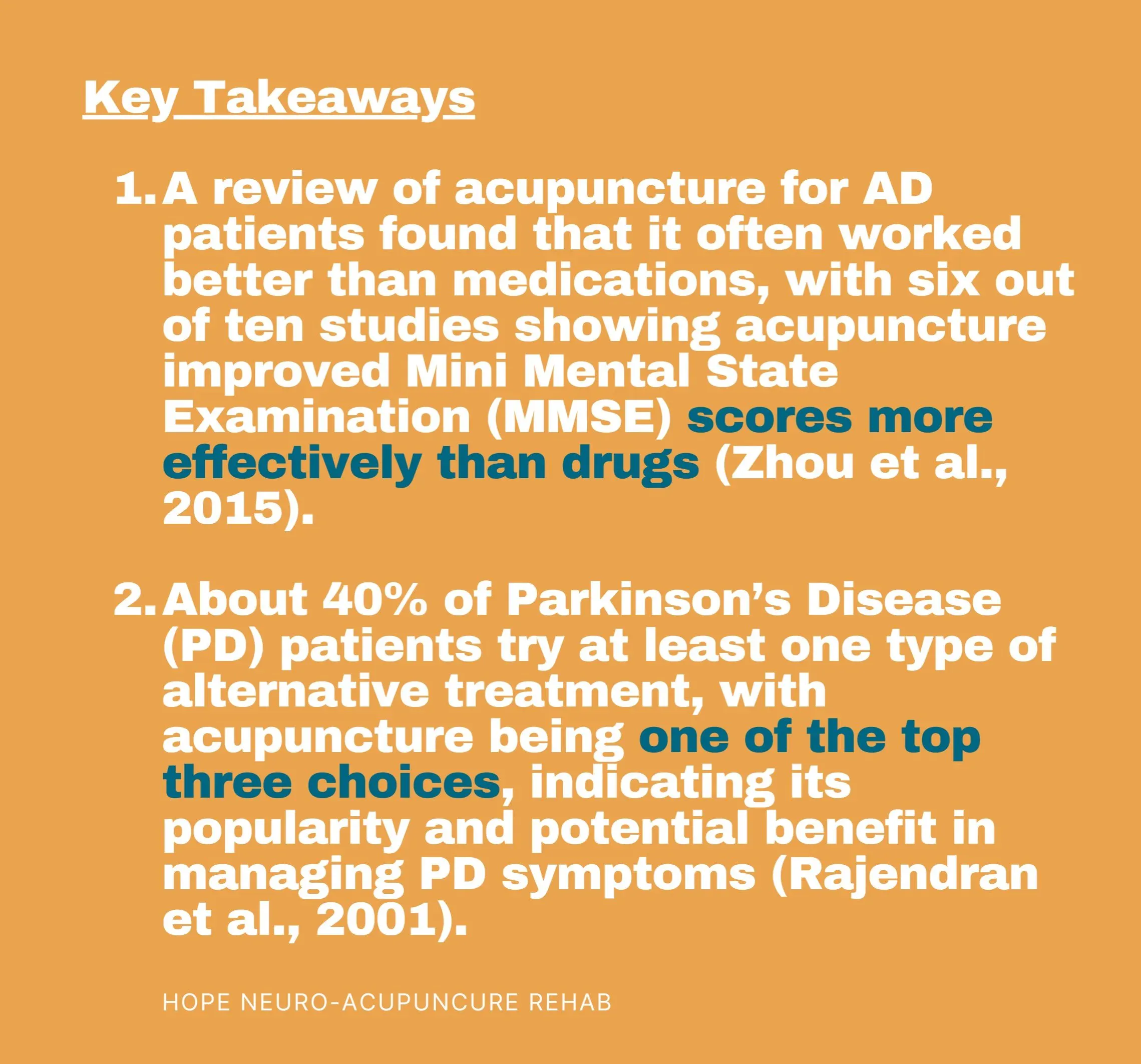 Example #2: A large review of 10 studies with 585 people found that acupuncture often worked better than medicines for improving their Mini Mental State Examination (MMSE) scores, which is a test for brain function. Six studies showed that acupuncture did better than drugs, and three other studies found that using acupuncture with a drug called “donepezil” worked better than just the drug alone for improving these scores. Also, the acupuncture was safe and drug-free, with very few people having side effects (Zhou et al., 2015).