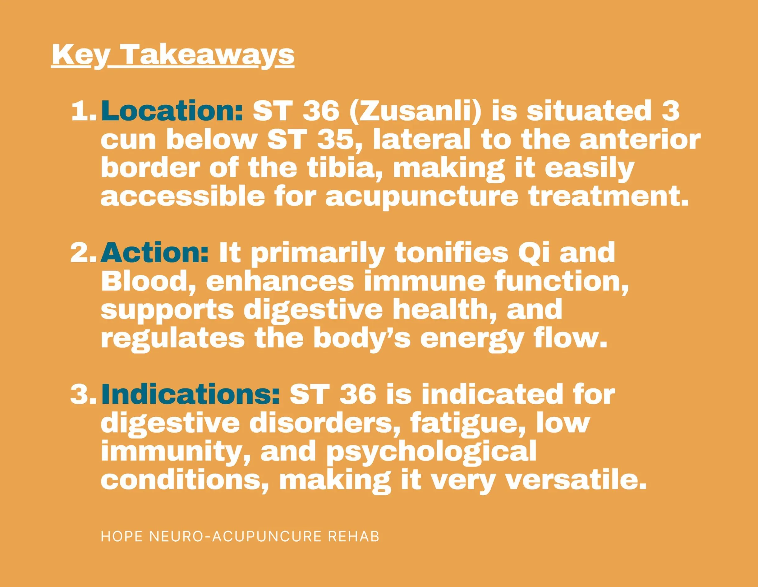 Given ST 36's role in treating a wide range of conditions, for those seeking less-invasive options it could be preferred to incorporating other techniques such as electro-acupuncture or acupressure.